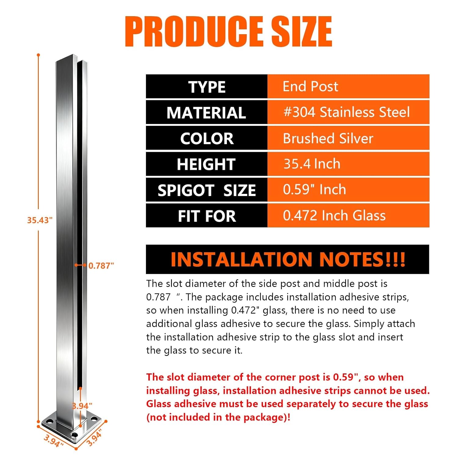 SPECIFITIONS:Type: end post; Materials: 304 stainless steel; Color: brushed silver; Heght: 3ft(35.43inch); Tube diameter: 2" x 2"; Tube wall thickness: 0.048"; Base diameter: 4" x 4"; Base plate thikcness: 0.24" PACKAGE INCLUDE: 1*end post; 1 x mount strip; 4 x wood bolt; 4 x concrete bolt